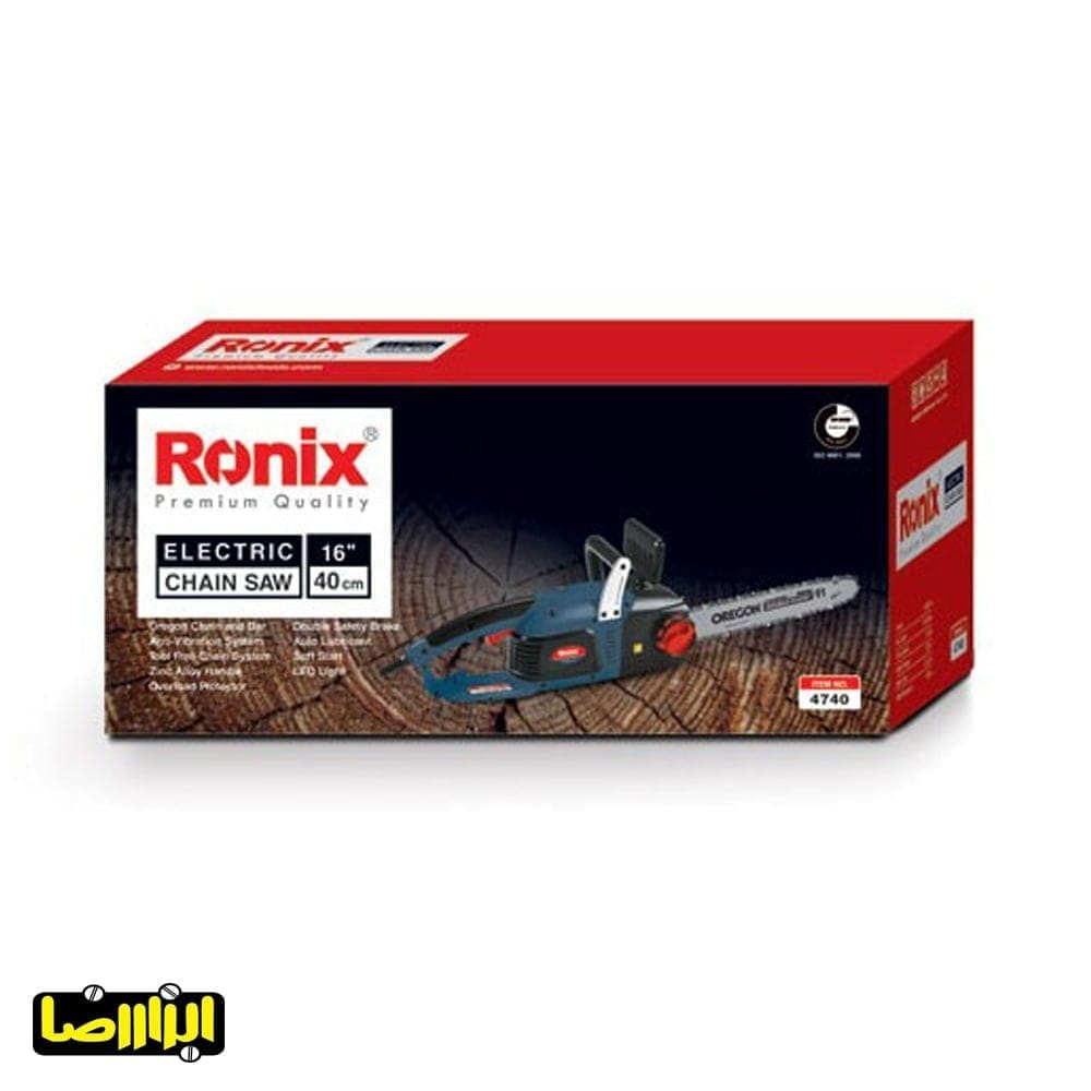 اره زنجیری برقی رونیکس 2400 وات مدل 4740 با توان 2400 وات توانایی به گردش درآوردن تا 7000 دور در دقیقه در حالت آزاد را دارد. این اره زنجیری برقی با وزنی معادل 5.5 کیلوگرم و با شکل ارگونومیک خود توانسته است راحتی کار را برای کاربران خود فراهم کند. طول ساطور درنظر گرفته شده برای این ابزار باغبانی 40 سانتی متر و مجهز به  زنجیر OREGON ساخت آمریکا ، پایه آلومینیومی قرارگیری ساطوری و زنجیر جهت افزایش طول عمر است. طراحی منحصر به فرد قرارگیری موتور در راستای دستگاه موجب شده است تا عمر کارکرد قطعات مکانیکی و الکتریکی بالاتر برود و موجب راحتی کاربر در حین استفاده از این ابزار برقی میشود. اره زنجیری برقی رونیکس مدل 4740 دارای قابلیت قطع درختان با عملکرد بالا و طراحی ارگونومیک جهت سهولت در استفاده در هنگام کار می باشد. مجهز به سیستم ترمز اضطراری جهت کاربری ایمن در طولانی مدت، از دیگر ویژگی های خوب این محصول به شمار میرود. از دیگر نکات قابل ذکر میتوان به سیستم تنظیم کشش زنجیر، بدون نیاز به آچار و همچنین دارا بودن سیم سیار 5 متری مطابق با استاندارد کابل VDE آلمان اشاره کرد.