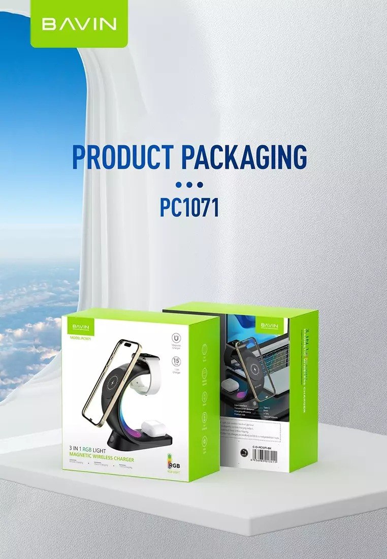 شارژر وایرلس Bavin PC1071 از پلاستیک مقاوم ساخته شده و دارای چند عملکرد مختلف است که به جذابیت این محصول افزوده است. وزن بدنه این شارژر وایرلس 277 گرم و ابعاد 145*147*66 شارژر وایرلس مگنتی برای گوشی آیفون 12 به بعد، شارژر وایرلس معمولی برای هندزفریها و یک قسمت برای شارژ اپل واچ از امکانات این شارژر وایرلس چند کاره است. قسمت مگنتی دارای آهنربای قوی است. بر روی این استند همچنین LED با نورپردازی RGB قرار گرفته است که به خصوص هنگام استفاده در شب زیبایی و جلوه خاصی به استند شارژ باوین PC1071 میبخشد.