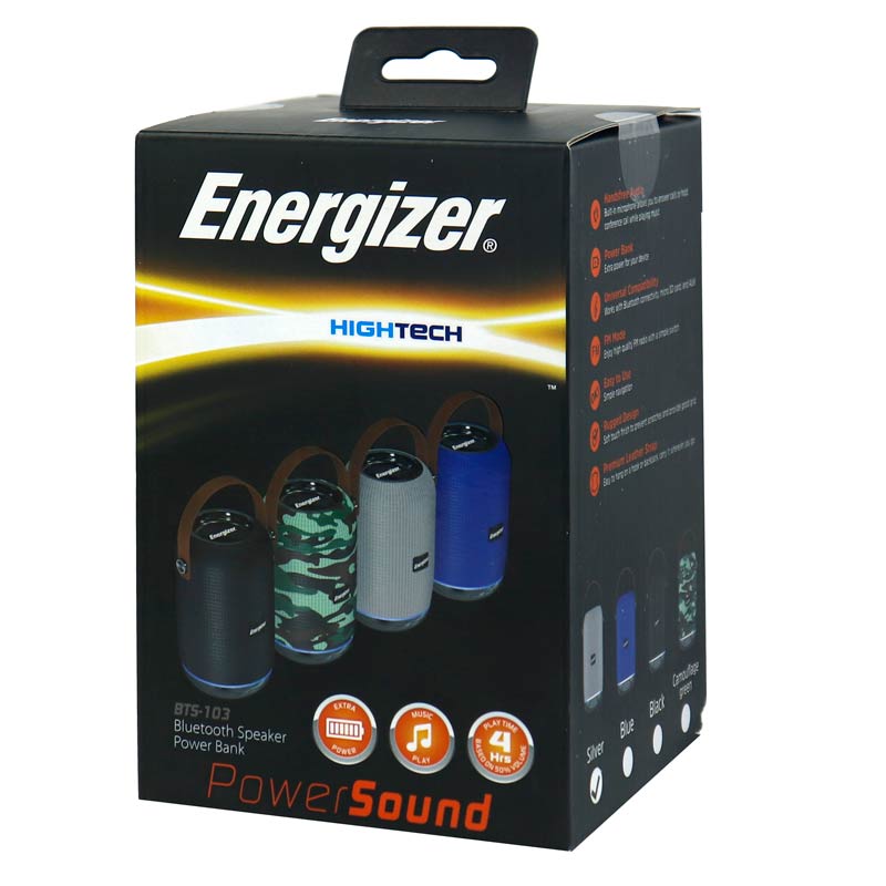 اسپیکر بلوتوثی قابل حمل انرجایزر مدل BTS103 یک محصول خوش ساخت با طراحی استوانه ای شکل می باشد و متریال مرغوب با مقاومت بالا در برابر ضربه، فشار و دیگر آسیب های احتمالی در تولید آن به کار رفته است. یک بند نیز برای آویزان کردن و جابجایی راحت تر دستگاه پخش کننده صوتی بر روی بدنه وجود دارد. باتری لیتیوم یونی وظیفه تامین انرژی آن را بر عهده دارد که با ظرفیت ۱۲۰۰ میلی آمپر ساعت حدود ۴ الی ۵ ساعت (حجم ولوم ۵۰ درصد) به پخش موسیقی پرداخته و توسط کابل میکرو یو اس بی شارژ دوباره می شود.