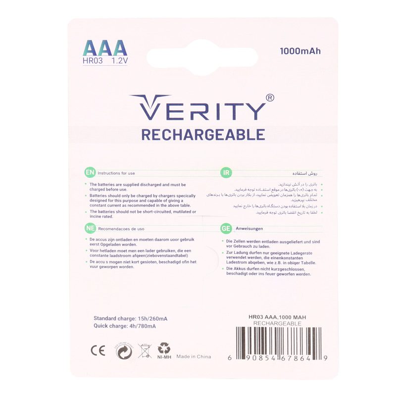 باتری دوتایی نیم قلمی شارژی Verity Rechargeable Ni-MH HR03 AAA 1000mAh