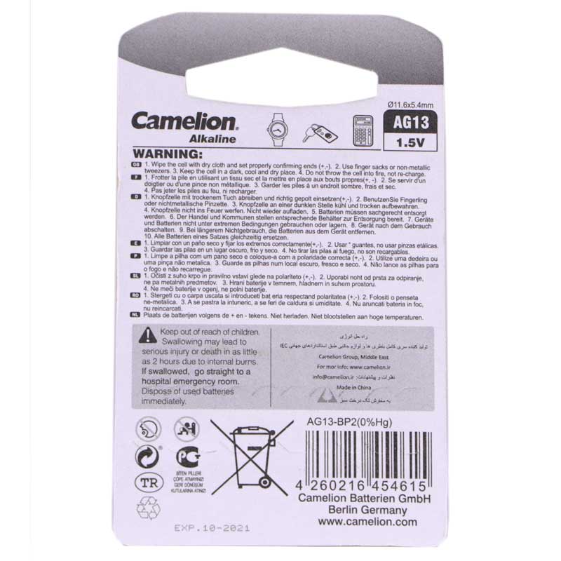 از باتری های سکه ای در دستگاه های مختلفی استفاده می شود که بیشترین کاربرد آن ها را معمولا در ساعت ها و وسایلی از این دست دیده ایم. باتری Camelion AG13 از باتری های سکه ای می باشد که برای استفاده در وسایلی مانند ساعت ، لیزر ، دزدگیر ماشین و… بکار گرفته می شوند.تکنولوژی بکار رفته در این محصول از نوع آلکالاین بوده که با استاندارد های محیط زیستی اروپا نیز سازگار است. در ساخت این محصول از جیوه نیز خبری نیست. ولتاژ AG13 برابر با ۱٫۵ ولت است و در پک این محصول دو عدد باتری قرار داده شده است.