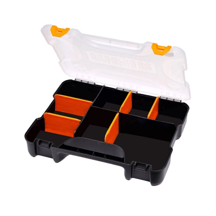 در جعبه ابزار مهر 35 سانتی متر مدل ORG3 با داشتن 5 تیغه متحرک، شما می‌توانید فضای داخلی جعبه را بر اساس اندازه و نوع ابزارها یا قطعاتی که نیاز به نگهداری دارند، تنظیم کنید. این امکان به شما کمک می‌کند تا از فضا بهینه استفاده کنید و دسترسی آسان به همه ابزارها داشته باشید. قفل این جعبه ابزار از پلاستیک با کیفیت و بسیار محکم ساخته شده است. این قفل از باز شدن ناگهانی و پخش شدن محتویات جعبه جلوگیری می‌کند و از ابزارها در برابر آسیب محافظت می‌کند.