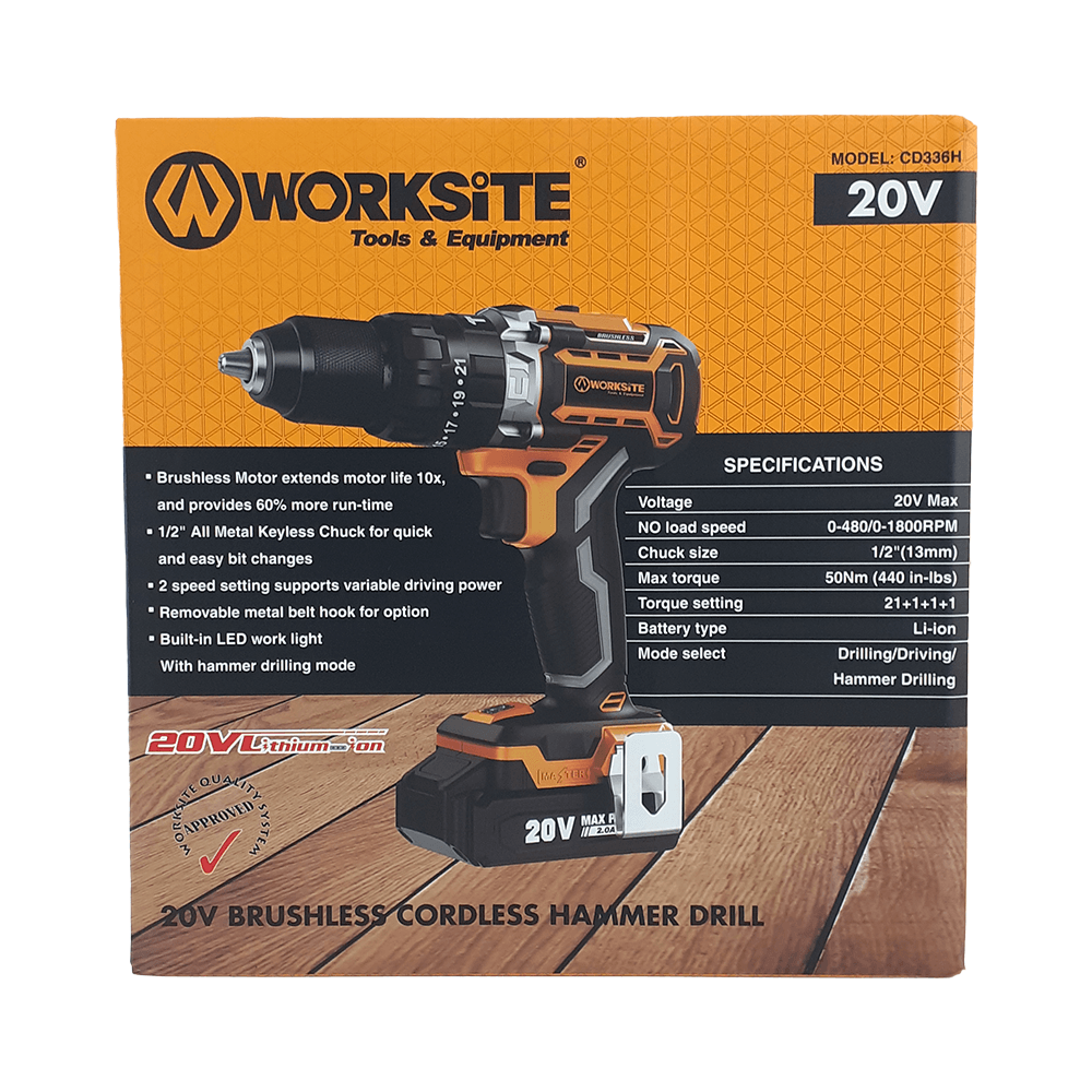 دریل پیچ گوشتی چکشی شارژی براشلس ورک سایت 20 ولت مدل CD336H تک باتری