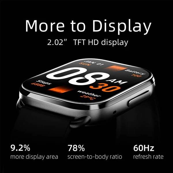 ساعت کیو سی وای Urban GS دارای صفحه نمایش AMOLED و 1.95 اینچی مستطیلی است. کیفیت HD در کنار رزولوشن 502*410 پیکسلی، تراکم پیکسلی 332 PPI و نرخ به روزرسانی 60 هرتزی، وضوح تصویر خوبی به ساعت بخشیده که از نگاه کردن به آن سیر نمیشوید.