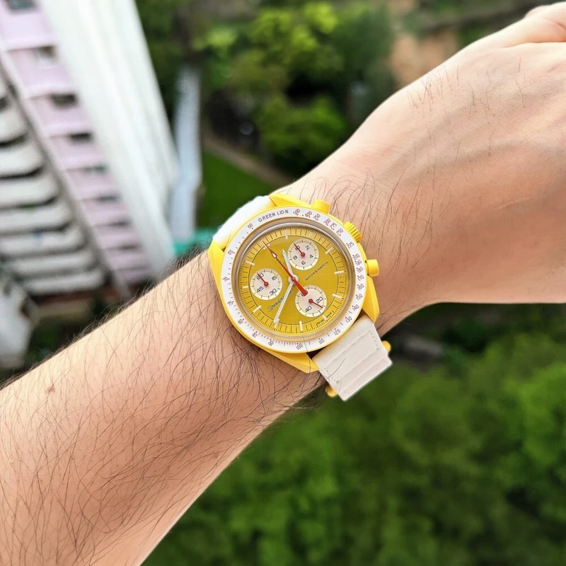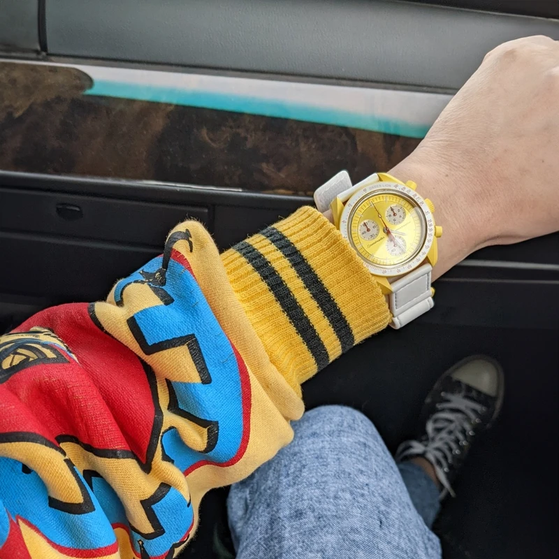 جنس بدنه و بند این ساعت از پلاستیک بوده و با توجه به ترکیب رنگ زرد و سفید به کار رفته در آن، ظاهر اسپرتی دارد.