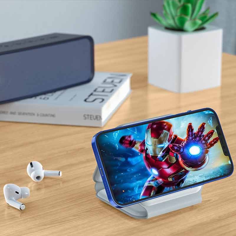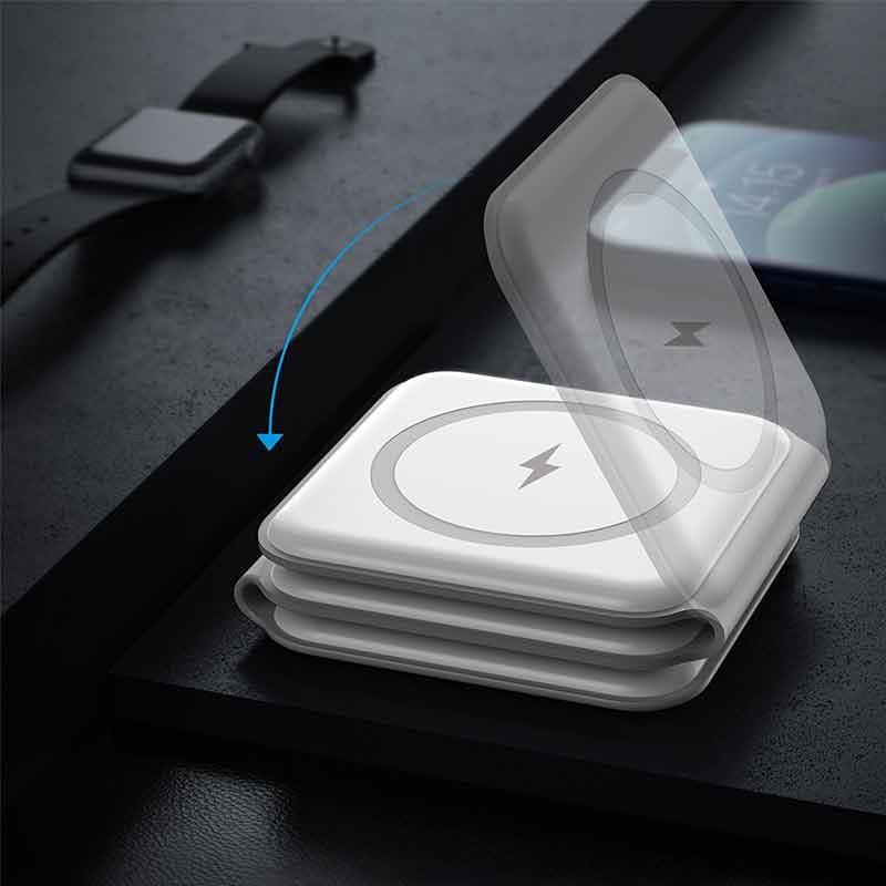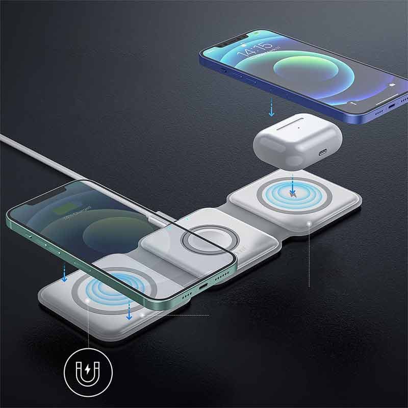 مجهز به سه عدد خروجی از نوع پد شارژ وایرلس مناسب برای شارژ همزمان گوشی، کیس شارژ ایرپاد و ساعت هوشمند
