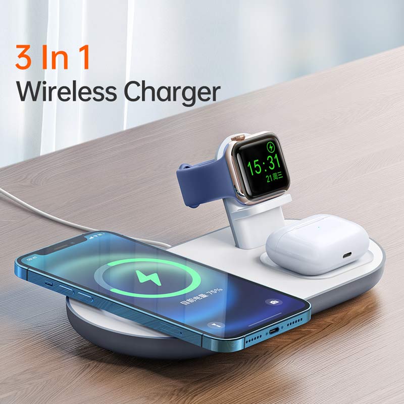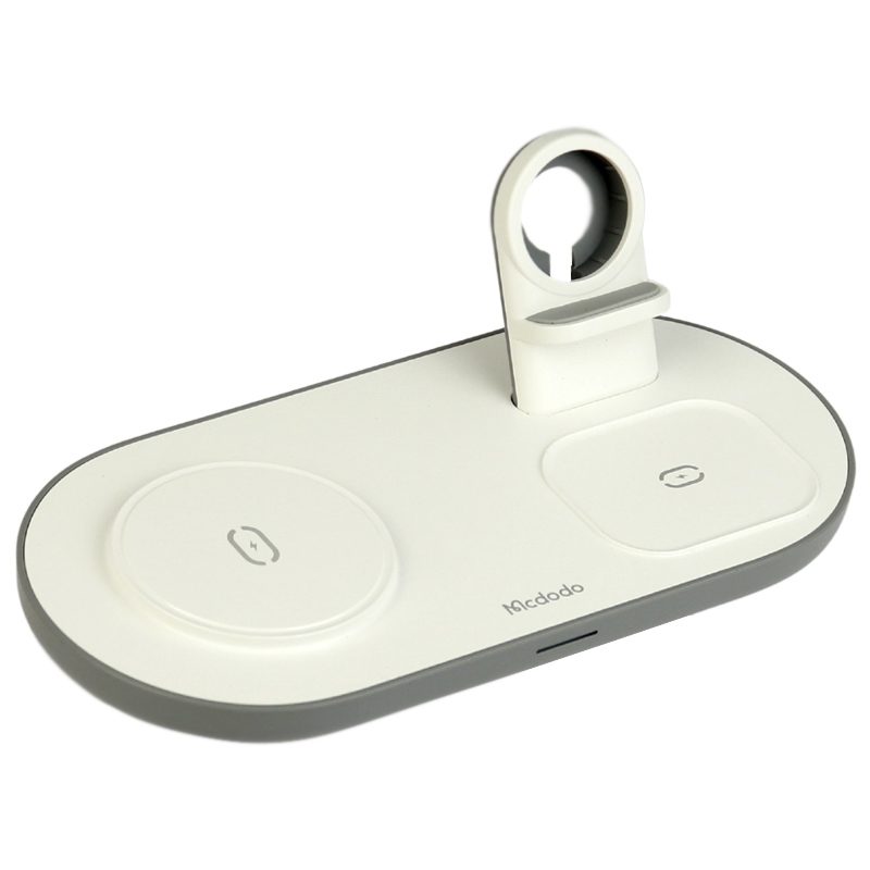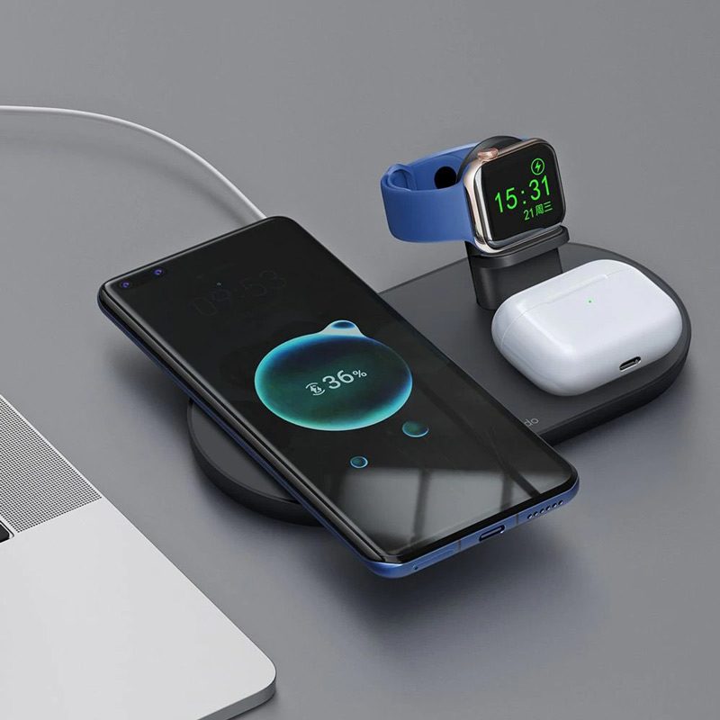 بهره مندی از سه پد شارژ وایرلس مناسب برای شارژ سه گجت هوشمند، شارژ بی سیم گوشی آیفون و اندروید، ساعت هوشمند و کیس شارژ هندزفری