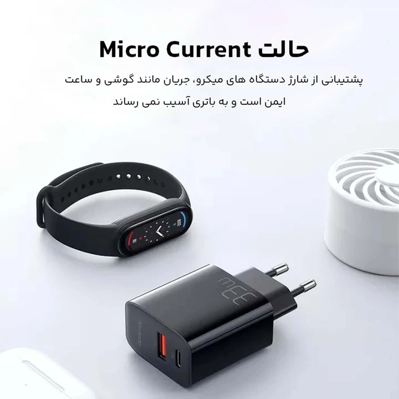 تایپ سی Type C: 5 ولت 3 آمپر | 9 ولت 3 آمپر | 12 ولت 2.5 آمپر | 15 ولت 2 آمپر | 20 ولت 1.5 آمپر؛ توان 33 وات.