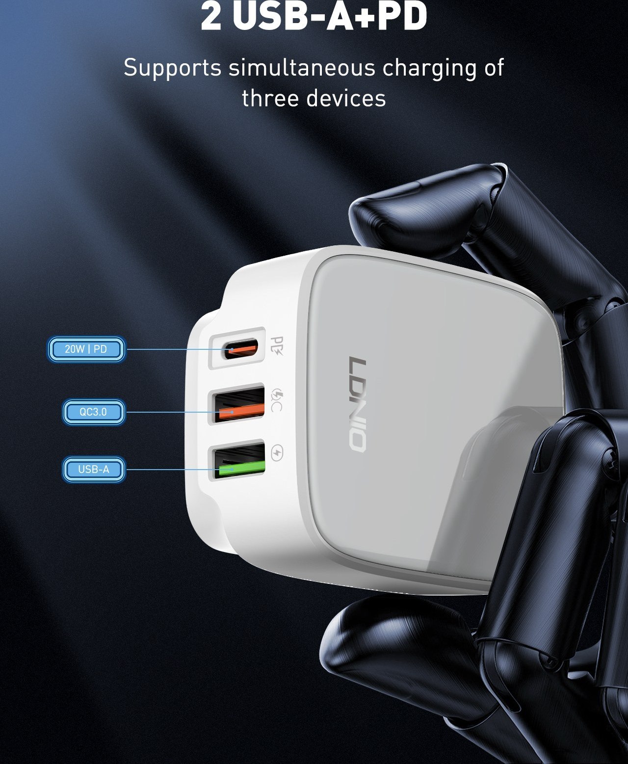 در شارژر دیواری الدینیو A2317C از تکنولوژیهای مختلف فست شارژ مانند PD و QC3.0 و استفاده شده که همین مساله کمک میکند گوشی خود را با سرعتی بیش از همیشه شارژ کنید. با استفاده از درگاههای PD و QC3.0 این شارژر میتوانید ظرف 1.5 تا 2 ساعت گوشی خود را به طور کامل شارژ کنید.