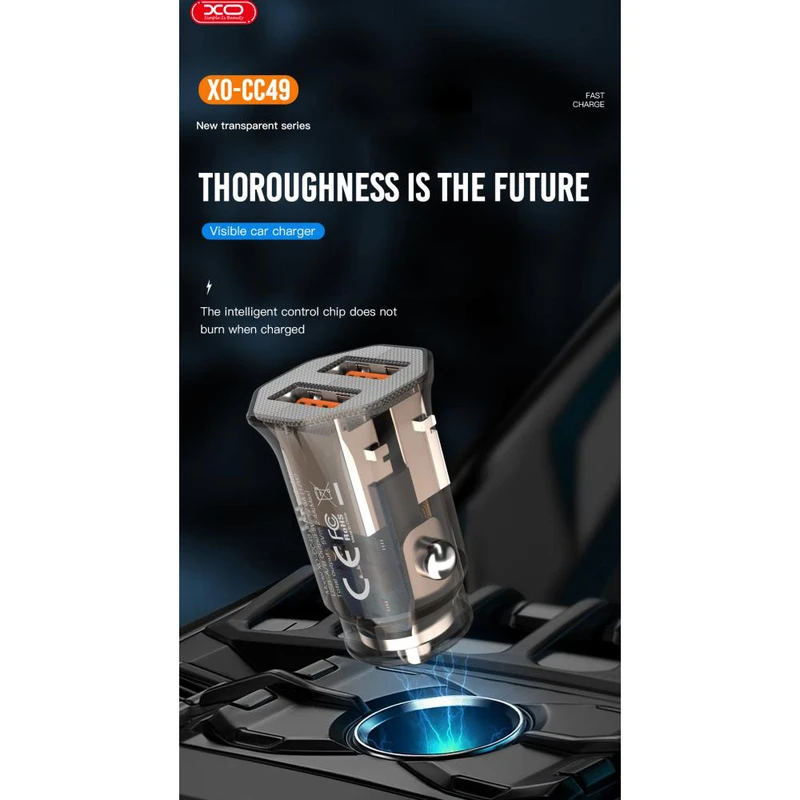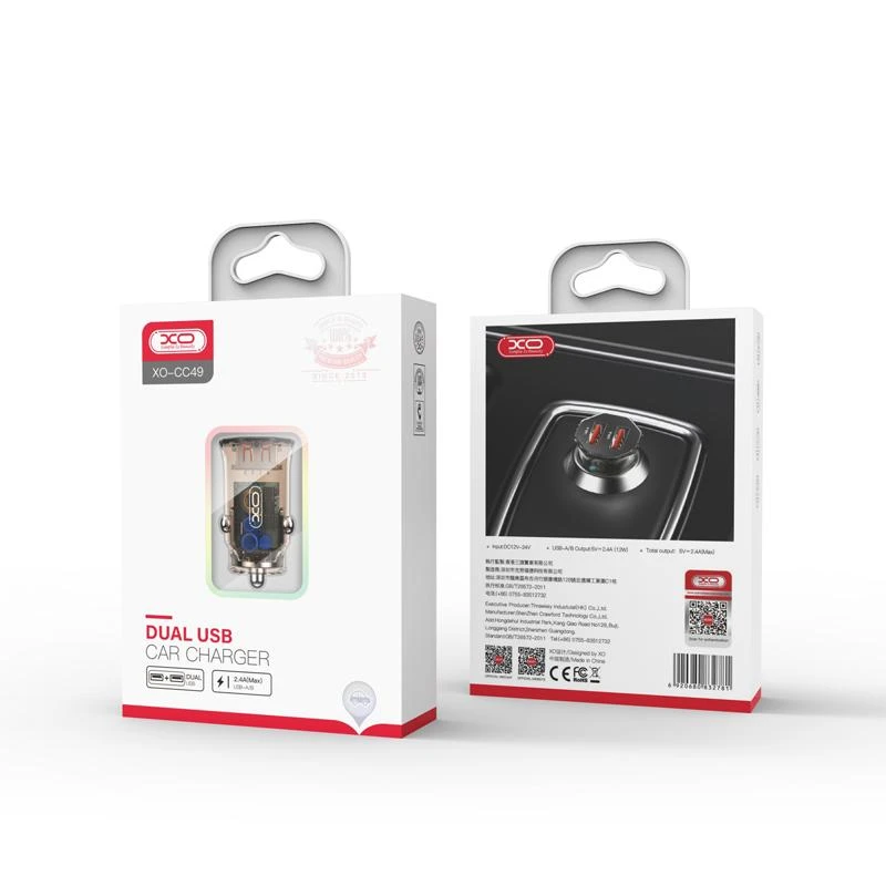 ورودی شارژر فندکی ایکس او CC49 به درگاه فندک ماشین وصل شده و تقریبا با تمام ماشینهای 12-24V سازگاری خواهد داشت. این شارژر دارای 2 پورت USB بوده که می توانید با سرعت بالا گوشی و دستگاه های خود را به صورت همزمان شارژ کنید. حداکثر شدت جریان آن 2.4 آمپر است. توان کلی خروجی این محصول 5V/2.4A می باشد.