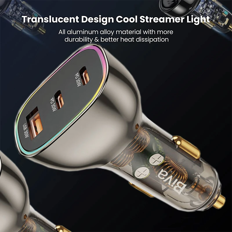 جنس بدنه ی شارژر فندکی بیوا Biva CC-012 از آلیاژ آلمینیوم و پلی کربنات ساخته شده که دارای مقاومت خوبی است. روی بدنه شارژ فندکی بیوا یک پورت USB و دو پورت Type-C تعبیه شده که می توانید به صورت تکی و یا همزمان از این پورت ها استفاده کنید. پورت های Type-C دارای تکنولوژی فست شارژهستند.