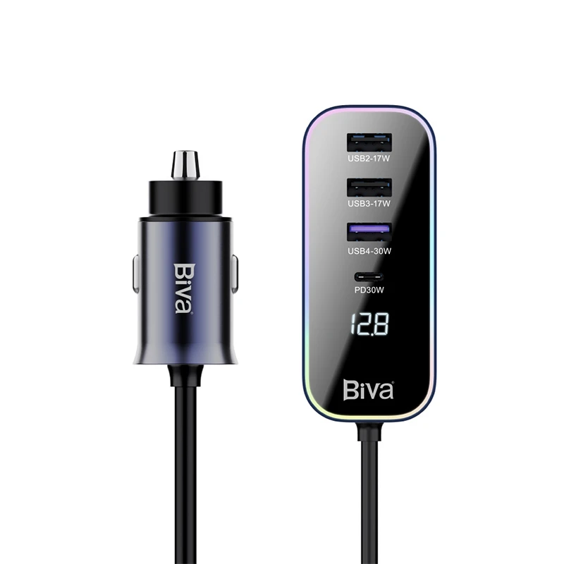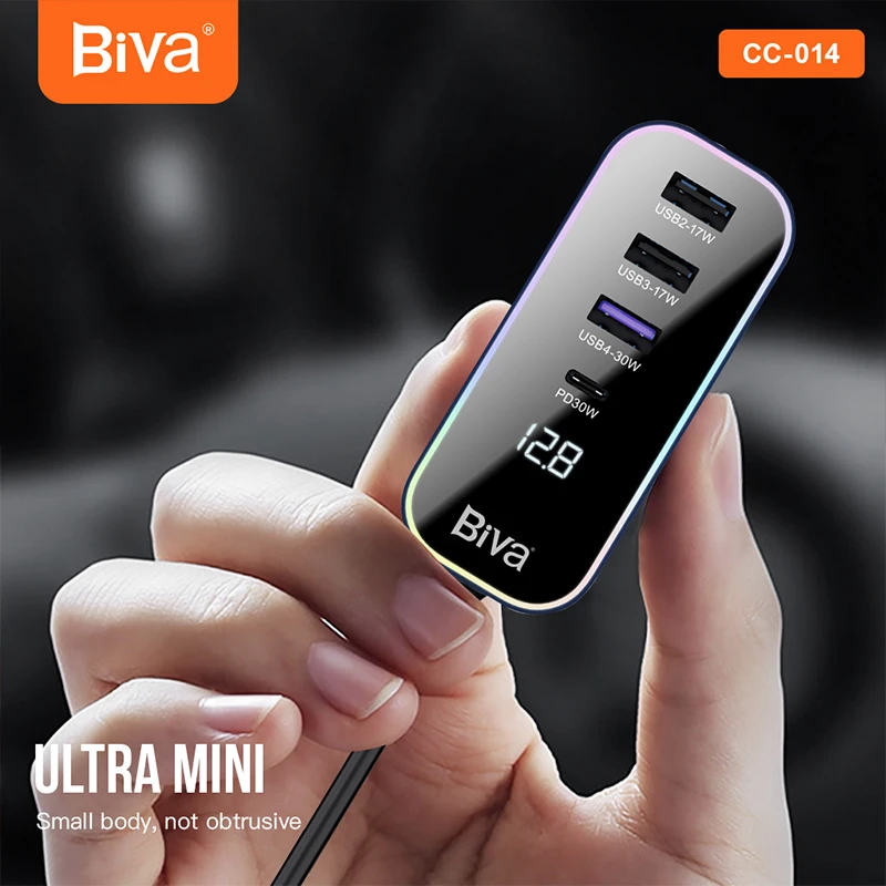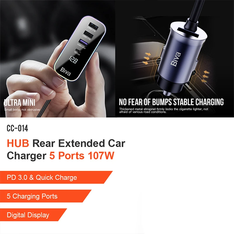 یکی از ویژگیهای منفی بسیاری از شارژرهای فندکی این است که روی درگاه فندکی خودرو قرار گرفته و در نتیجه تنها سرنشینان بخش جلو خودرو میتوانند از آنها استفاده و دست صندلی عقب خودرو نمیتوانند به راحتی از آن استفاده کنند. شارژر فندکی خودرو Biva CC-014 با هدف برآوردن چنین نیازی تولید شده است. یک کابل 1.5 متری بین بخش درگاههای شارژ و سر فندکی این شارژر قرار گرفته است که به کمک آن میتوانید به راحتی ازین شارژر در بخش صندلی عقب خودروی خود نیز استفاده کنید.