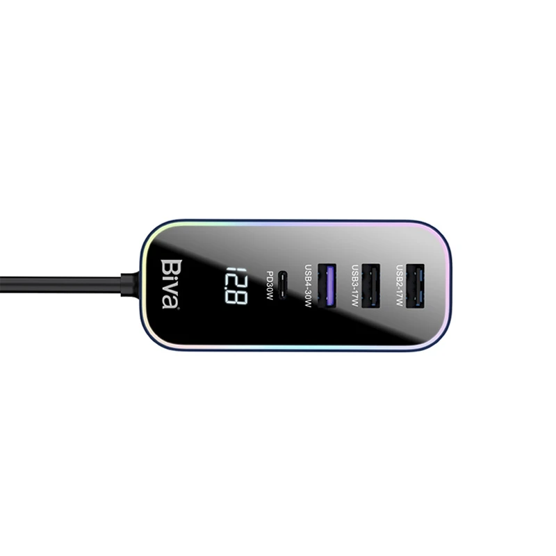 شارژر فندکی بیوا CC-014 دارای دو بخش است؛ در یک بخش 4 درگاه شارژ شامل 3 درگاه USB و یک درگاه Type-c است. در بخش دیگر نیز سر فندکی با یک پورت USB با توان 30 وات وجود داشته که به قسمت فندکی خودرو متصل خواهد شد. این دو قطعه توسط یک کابل 1.5 متری به هم متصل میشود. زیر درگاه های شارژر فندکی بیوا CC-014 نمایشگر دیجیتالی وجود داشته که باعث شده شما بتوانید ورودی را مشاهده کنید.