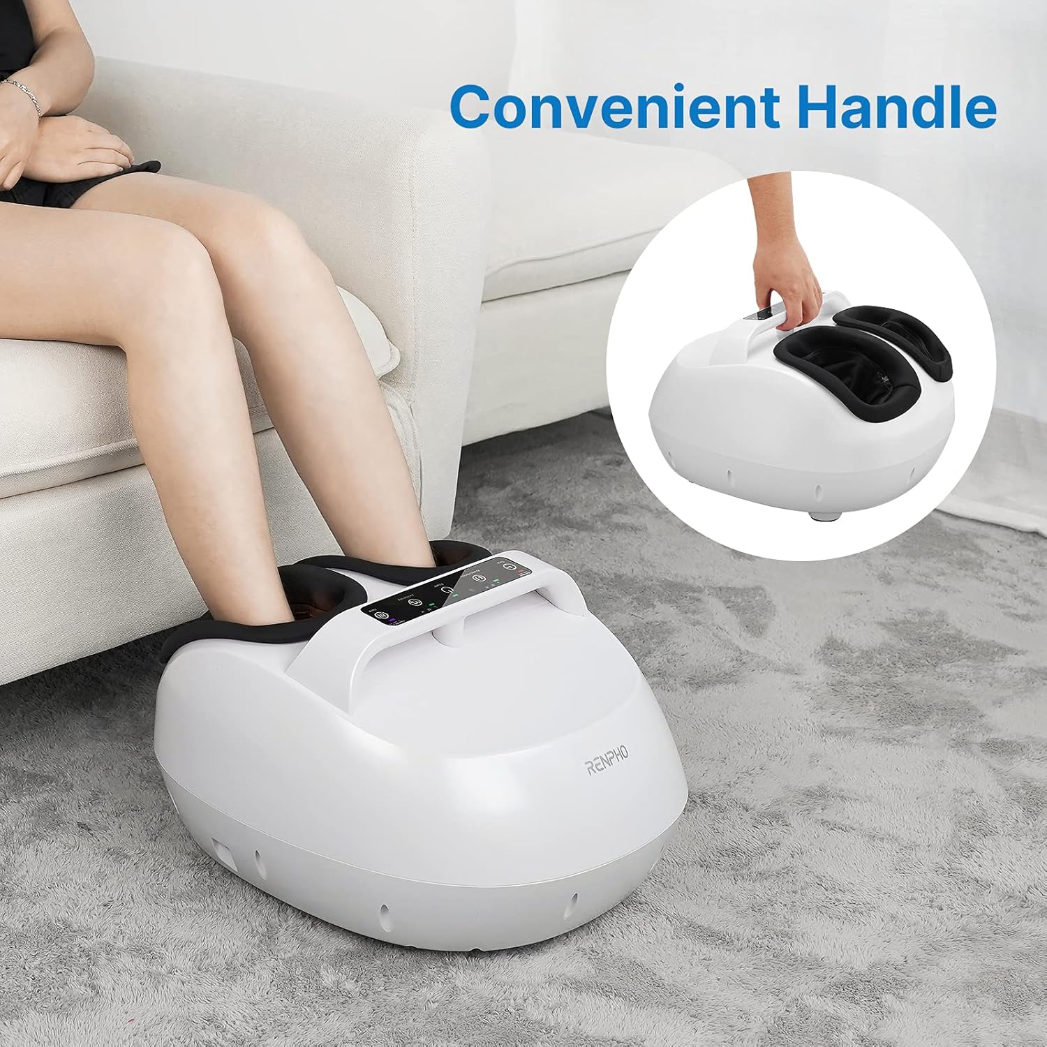 طراحی ارگونومیک: با استفاده از دستههای دسترسی آسان برای حمل و نقل، از قابلیت حمل نهایی لذت ببرید. این دستگاه ماساژور پای Renpho به صورت ارگونومیک طراحی شده است تا ساختار پای انسان را برای حداکثر راحتی تکمیل کند، برای پاهایی تا سایز 12 مردانه مناسب است. همچنین، دارای کنترل صفحه لمسی و ریموت است که به افراد امکان میدهد دستگاه را به راحتی و بدون خم شدن کنترل کنند.