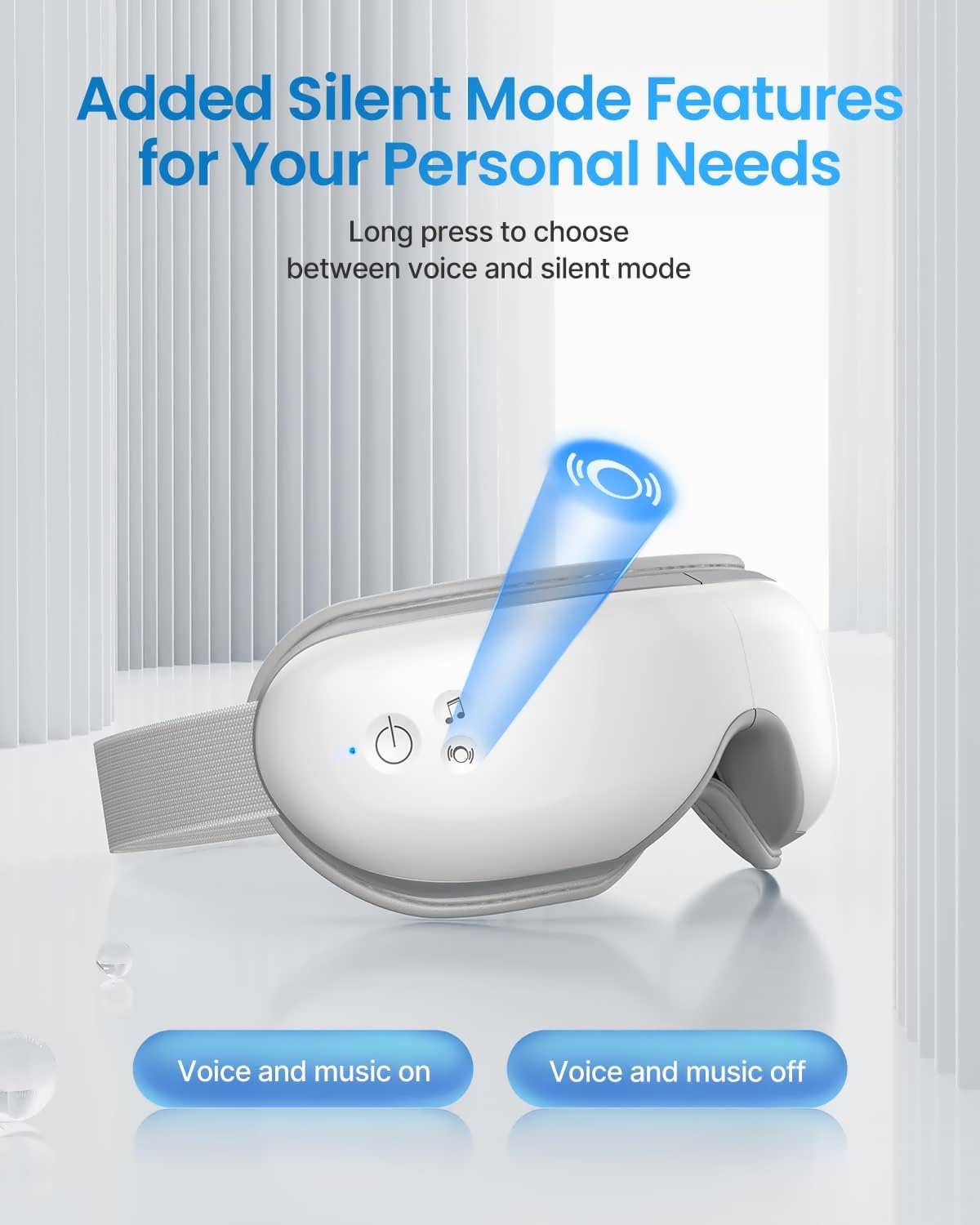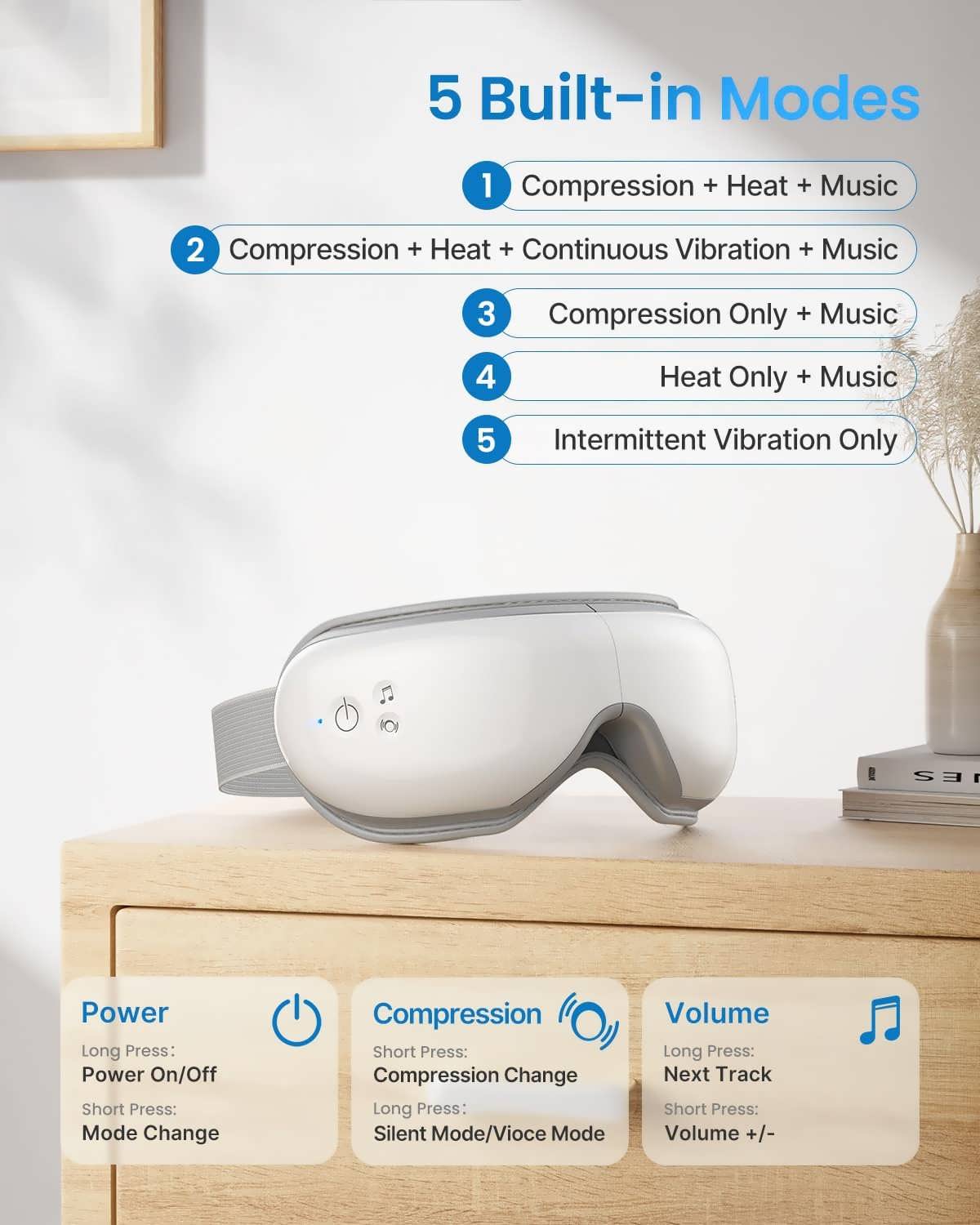 - چهار روش ماساژ ترکیبی: این دستگاه از چهار روش ماساژ مختلف شامل فشار هوا، لرزش، گرما و موسیقی برای ارائه یک تجربه جامع و موثر استفاده میکند. این ترکیب به تسکین درد چشم، بهبود گردش خون، کاهش سردرد و رفع خستگی مزمن چشم کمک مینماید.