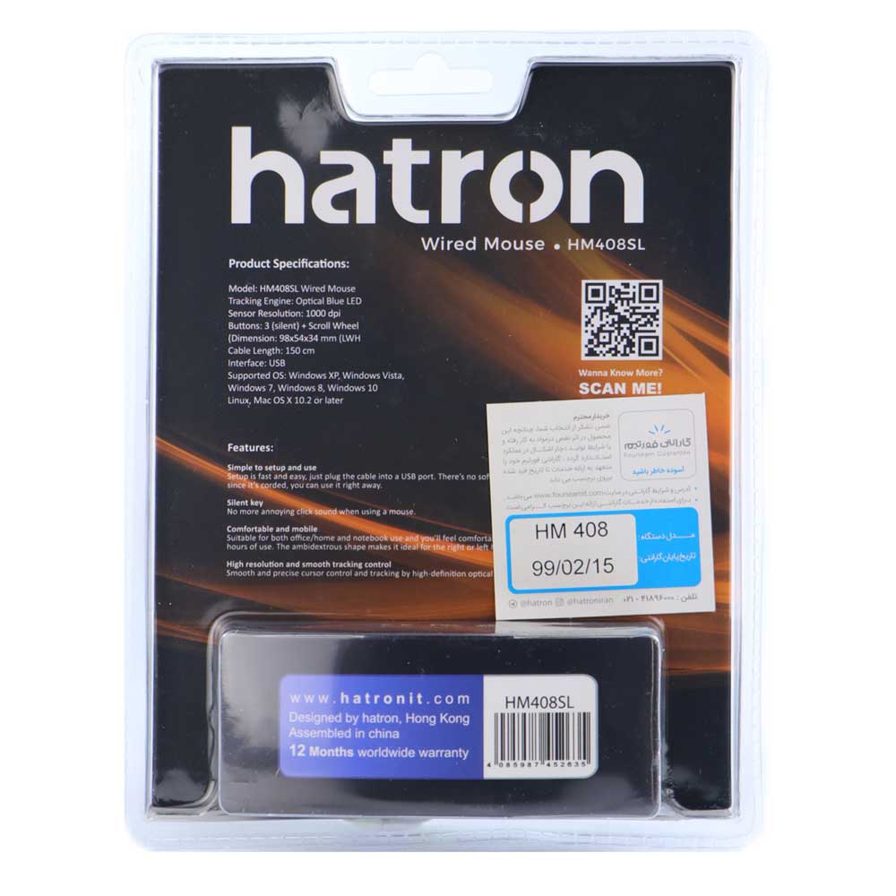 ماوس مدل HM408SL محصولی از برند Hatron می باشد که دارای اتصال با سیم است. ابعاد این محصول ۳۴ × ۵۴ × ۹۸ میلی متر است. طول کابل موس با اندازه ۱۵۰ سانتی متر برای استفاده خانگی و اداری بسیار مناسب بوده و رابط آن از نوع USB می باشد. همانگونه که روی پک موس درج شده است این محصول جزو دسته ی موس های بی صدا محسوب شده و کار کردن با آن بسیار مطلوب خواهد بود. موس دارای ۳ کلید (بی صدا) و یک اسکرول می باشد. دقت موس به ۱۲۰۰dpi می رسد و حسگر آن از نوع اپتیکال با نور آبی LED است. موس هترون با اغلب سیستم عامل ها از جمله Windows XP, vista, 7, 8, 10, Mac, Linux و… سازگاری دارد و طراحی آن به شکلی است که کاربر هنگام استفاده از آن راحت باشد.
