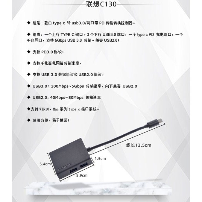 بدنه هاب لنوو Lenovo C130 دارای یک پوشش پلاستیکی از جنس ABS بوده که در برابر گرما و ضربه مقاوم است. ابعاد این هاب حدوده 59*53*15 میلی متری بوده و کابل این هاب 13.5 سانتی متر است.
