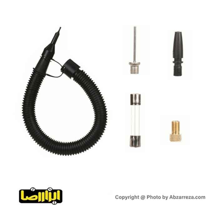 - به همراه نازل تشک بادکن ، نازل دوچرخه ، فیوز یدکی ، سوزن توپ ، کابل اتصال باتری و کیف
