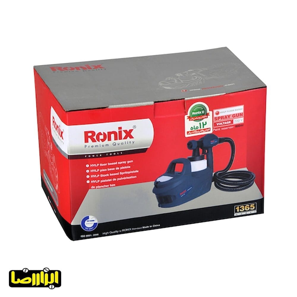 پیستوله برقی رونیکس 650 وات مدل 1365 دارای موتوری با توان 650 وات و قادر است رنگ را به میزان 800 میلیلیتر در دقیقه پاشش کند. مخزن رنگ این پیستوله برقی به راحتی از دستگاه جدا میشود و تا 800 میلیلیتر گنجایش انواع رنگ را در خود دارد. این ابزار برقیدارای طراحی منحصر به فرد ارگونومیک در قسمت تفنگی جهت راحتی کاربر و اثر بخشی عملکرد در طولانی مدت میباشد.این پیستوله برقی دارای لوله خرطومی میباشد که جهت رنگ پاشی آسانتر مورد استفاده قرار میگیرد. قابلیت باز شدن سری قسمت تفنگی جهت تمیز کردن آسان دستگاه و سیستم اتصال سریع و پیشرفته بدنه جهت سهولت تمیز کاری و ازدیاد عمر کارکرد، از دیگر ویژگی های متمایز کننده این ابزار برقی به شمار میرود.