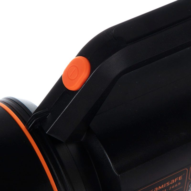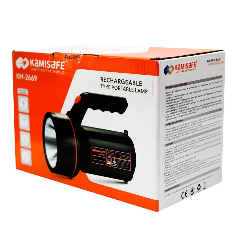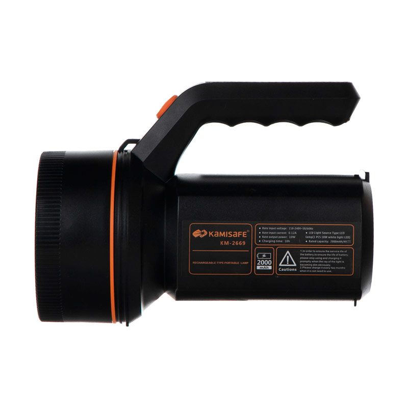 چراغ قوه مدل KM-2669 کامی سیف، از ابعاد جمع جور و بدنه ای از جنس پلاستیک سخت ساخته شده است که در برابر ضربه، فشار و دیگر آسیب ها مقاومت بالایی دارد. یک دستگیره با طراحی ارگونومیک و محفظه ای برای قرارگیری بند نیز فراهم شده که در کنار وزن سبک، قابل حمل بودن این چراغ قوه دستی را در مسافرت، کمپینگ کوهنوردی، شغل هایی مانند نگهبانی و استفاده در منزل بسیار راحت تر کرده است. این دستگاه دارای ۱ عدد لامپ LED مهتابی با توان خروجی ۱۰ وات می باشد که با برد نوردهی ۷۵ تا ۸۰ متر، می تواند محیط های اطراف و تاریک را با قدرت بالایی روشن نماید. از دیگر ویژگی های عالی این چراغ قوه، مقاومت در برابر آب می باشد تا با خیالی آسوده در شرایط آب و هوایی نامناسب در زیر باران و با کارایی کامل و نوردهی قدرتمند از آن استفاده کنید.