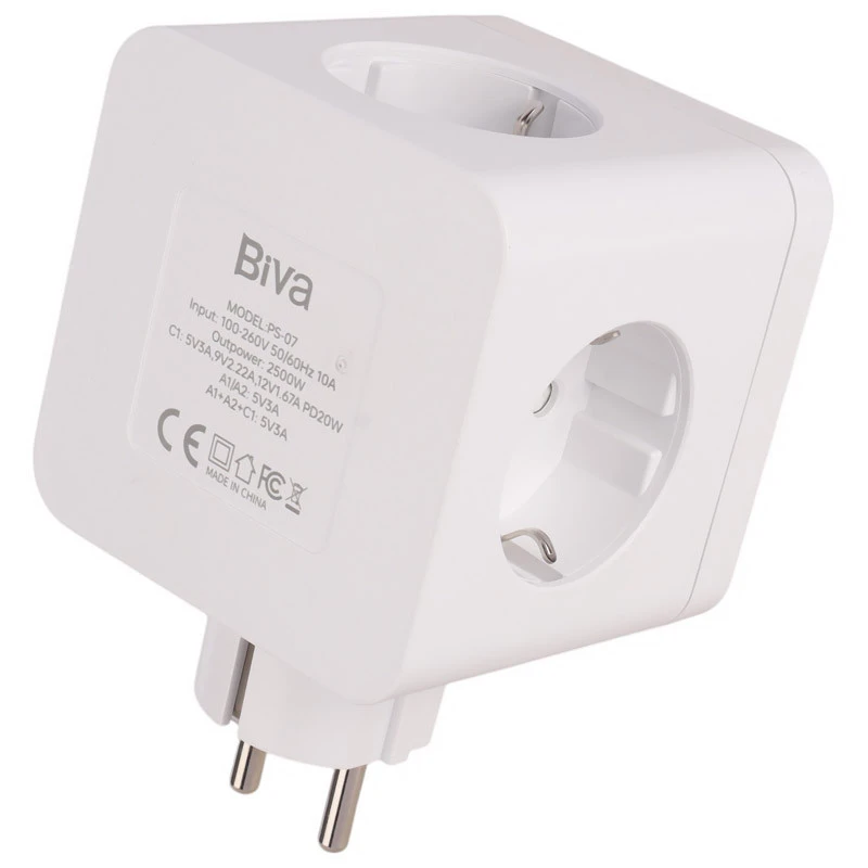 طراحی شیک و منحصربه‌فرد چند راهی برق و شارژر بیوا PS-07 یکی از ویژگی‌های این شارژر است. این چندراهی دارای طراحی مکعبی بوده و که در سه وجه خود دارای 3 پریز برق و در یک وجه خود دارای 2 پورت USB و یک پورت Type-c است. پریزهای برق روی این چند راهی نیز از نوع EU / ایرانی است. در ساخت این چندراهی از پلاستیک بسیار باکیفیت پلی کربنات ساخته شده که تا حرارت 750 درجه مقاوم است.