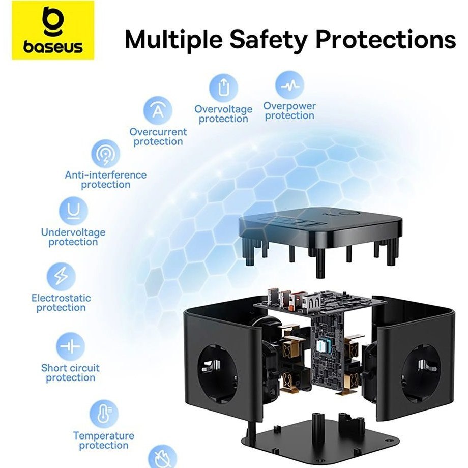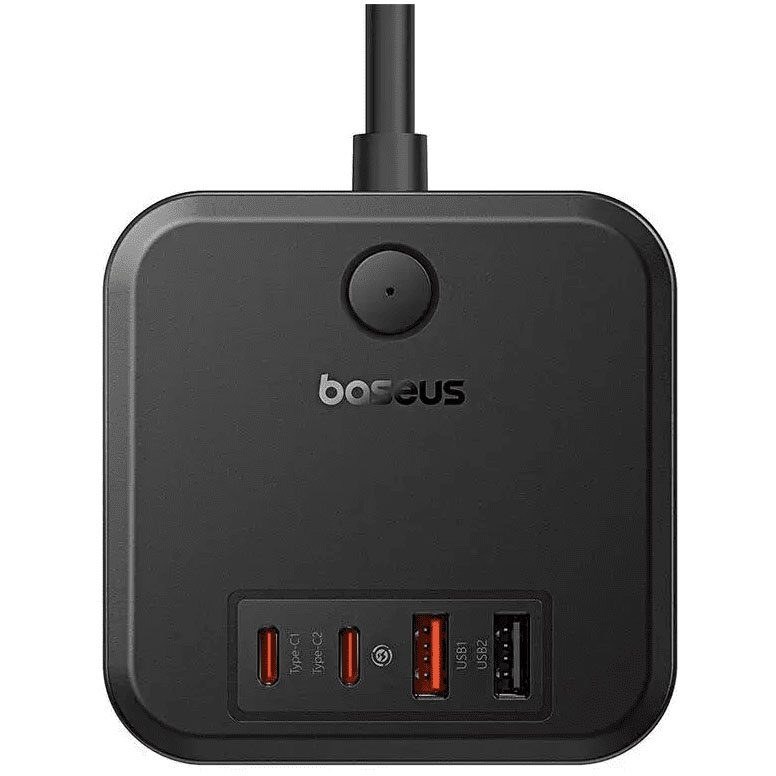هاب شارژر 7 پورت بیسوس دارای 7 پورت شارژ شامل 2 خروجی USB و 2 خروجی Type C و 3 خروجی AC (پریز برق) است. همچنین این محصول دارای یک کابل متصل تایپ سی است و برای دستگاه هایی که از درگاه Type C پشتیبانی می‌کنند قابل استفاده است. طول این کابل 80 سانتی متر است که باعث می‌شود به سادگی بتوانید آن را به وسایل مختلف خود وصل کنید. از دکمه لمسی موجود بر روی این محصول می‌توانید برای روشن یا خاموش کردن آن استفاده کنید. سیم برق این هاب به طول 1.5 متر، از ضخامت و کیفیت بالایی برخوردار است که در استفاده مداوم هیچ گونه مشکلی نخواهید داشت.