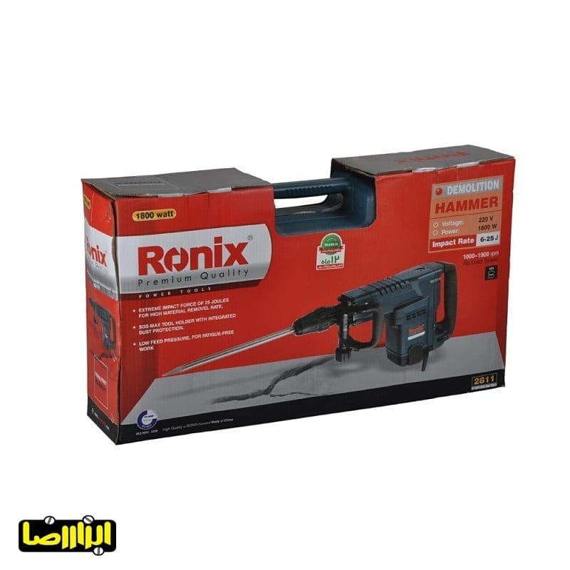 چکش تخریب 11 کیلویی رونیکس مدل 2811 دارای موتوری قدرتمند با توان 1800 وات و گیربکس صنعتی جهت ایجاد قدرت ضربه ای تا 25 ژول در مصارف مداوم و پر فشار صنعتی و وزنی برابر 11 کیلوگرم میباشد. منبع تغذیه مورد نیاز برای استفاده از این دستگاه، برق شهری است. همچنین مجهز به کلید و دیمر با کیفیت تحت استاندارد TUV , CE نیز خواهد بود. چکش تخریب 11 کیلویی رونیکس مدل 2811 مجهز به تقویت عایق بندی قسمت سیم پیچ دستگاه می باشد که جهت جلوگیری از آسیب دیدگی دستگاه بسیار حائز اهمیت است. مجهز به سیستم قلم گیر جدید ضد غبار و طراحی شده برای انتقال حداکثر نیرو به قلم جهت اثر بخشی تخریب کاری از دیگر ویژگی های متمایز کننده این محصول به شمار میرود. این محصول شرکت رونیکس دارای قدرت و توانایی 1900 ضربه در دقیقه را دارا می باشد و با طراحی ارگونومیکی که دارد، میزان لرزش برگشتی در اثر ضربه را کاهش و قدرت کاربری را افزایش می دهد. این محصول دارای کیف BMC مقاوم و ضدضربه میباشد. محصول فوق دارای دارای ضمانت نامه 12 ماه شرکت رونیکس نیز خواهد بود.