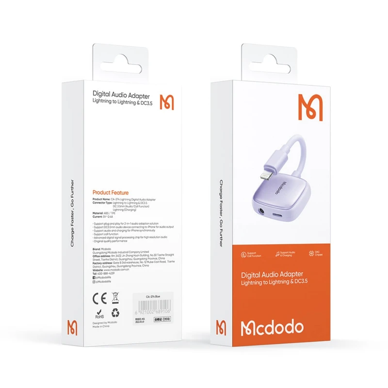 حداکثر جریان / ولتاژ خروجی پورت لایتنینگ تبدیل 1 به 2 لایتنینگ مک دودو CA-2740 برابر 5V/2.4A است. برای استفاده از تبدیل Mcdodo CA-2740 نیازی به نصب درایور ندارید. کافیست وصل و استفاده کنید. تبدیل 1 به 2 لایتنینگ مک دودو CA-2740 از امکان عملکرد صحیح کنترل سیمی هندزفری پشتیبانی می کند. وزن این تبدیل 11.8 گرم است.