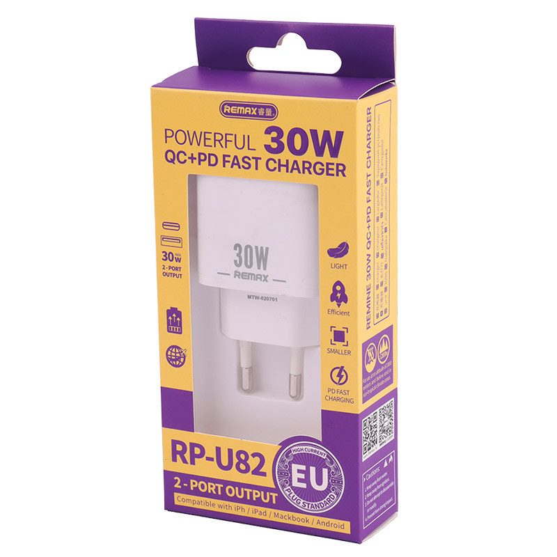 شارژر دیواری فست شارژ ریمکس مدل RP-U82 با توان خروجی 30 وات