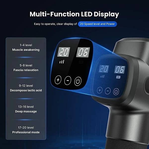 ماساژور تفنگی رنفو دارای 20 حالت سرعت مختلف است که به شما امکان میدهد تا قدرت ماساژ را متناسب با نیاز خود تنظیم کنید. از سرعتهای کم برای ماساژ ملایم و آرامشبخش و از سرعتهای بالا برای ماساژ عمیق و ریکاوری عضلات بعد از تمرینات ورزشی استفاده کنید.